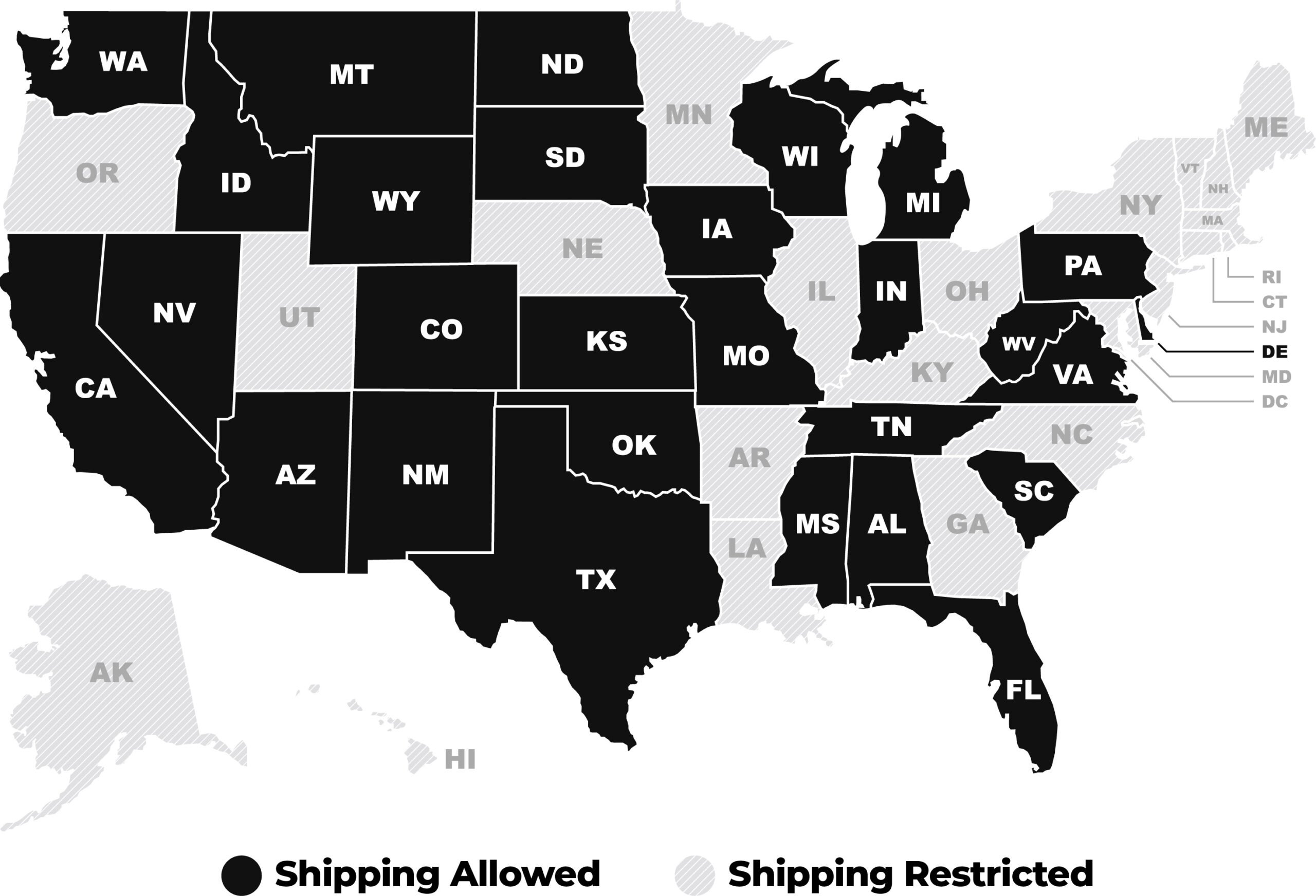 Shipping is restricted in the following states: ALASKA, ARIZONA, ARKANSAS, COLORADO, CONNECTICUT, DELAWARE, HAWAII, IDAHO, IOWA, KANSAS, KENTUCKY, LOUISIANA, MASSACHUSETTS, MICHIGAN, MINNESOTA, MISSISSIPPI, MONTANA, NEBRASKA, NEVADA, NEW YORK, NORTH DAKOTA, OHIO, OREGON, RHODE ISLAND, SOUTH CAROLINA, UTAH, VERMONT, WASHINGTON